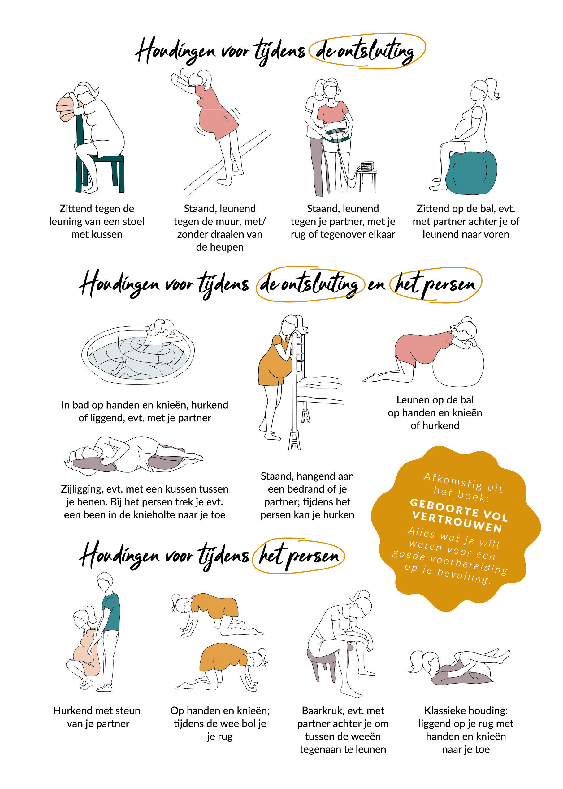 Wanneer je even online gaat zoeken naar bevalhoudingen zal je het meteen zien: het aantal opties is legio. Ik smijt hier dan ook graag gewoon een leuke illustratie met wat ideetjes: